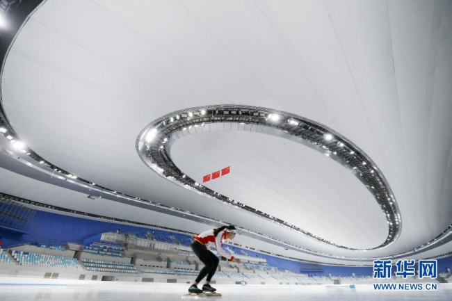 2021年1月19日,国家速滑馆运行团队速度滑冰项目竞赛主任王北星在首次制冰完成后试滑。新华社记者 张晨霖 摄