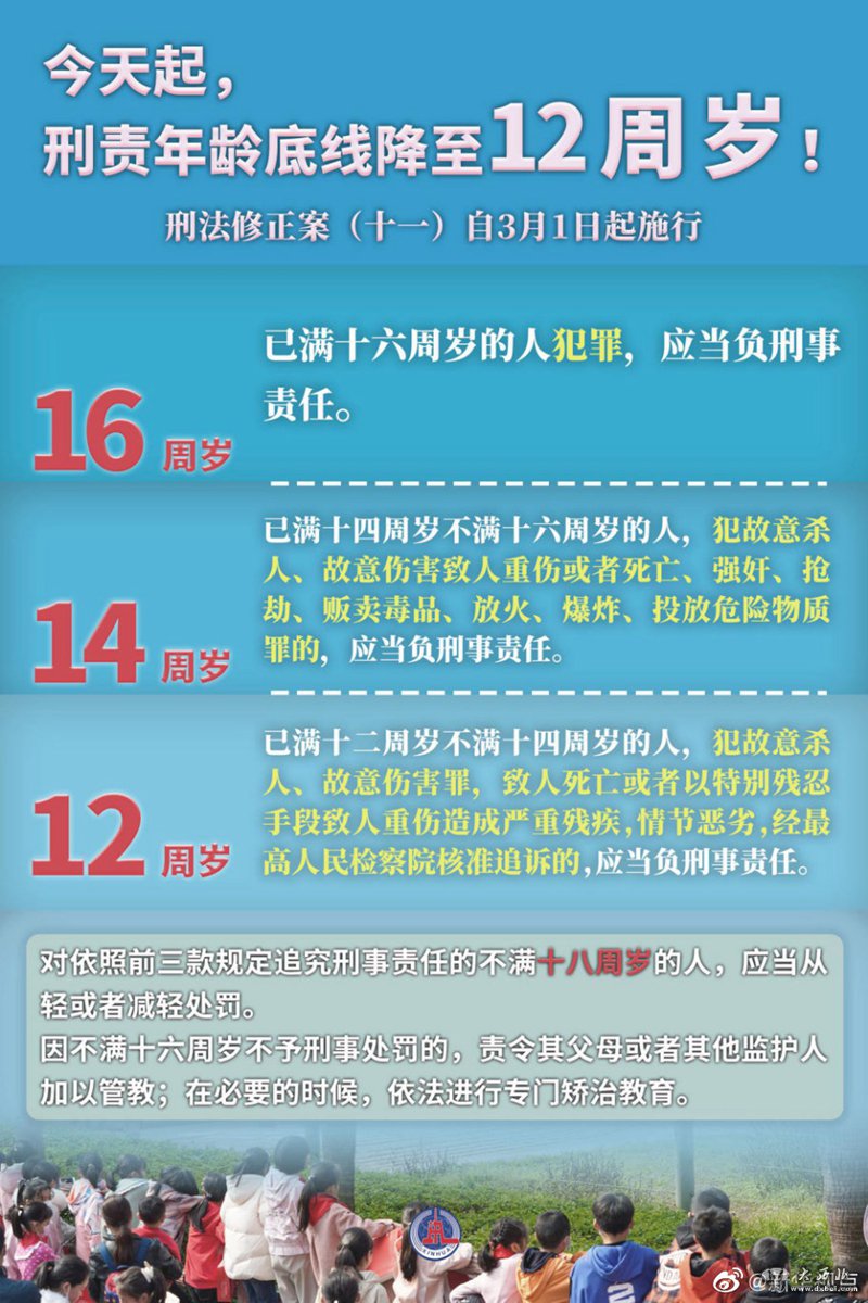 大西北网讯 3月1日,刑法修正案(十一)正式施行,其中对刑事责任年龄规定作出的调整正式生效。12周岁、14周岁、16周岁、18周岁……这些界线分别意味着什么?看刑法如何划定刑事责任年龄↓↓(记者罗沙、徐壮)