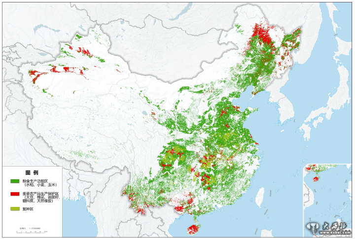 这张图白色为底,以绿、红标识的两个区域,代表着我国粮食生产功能区和重要农产品生产保护区,关系到我国14亿人能不能吃得饱、吃得好。