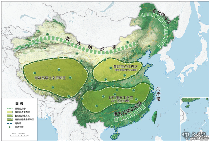 “四带”——东北森林带、北方防沙带、南方丘陵山地带、海岸带。
