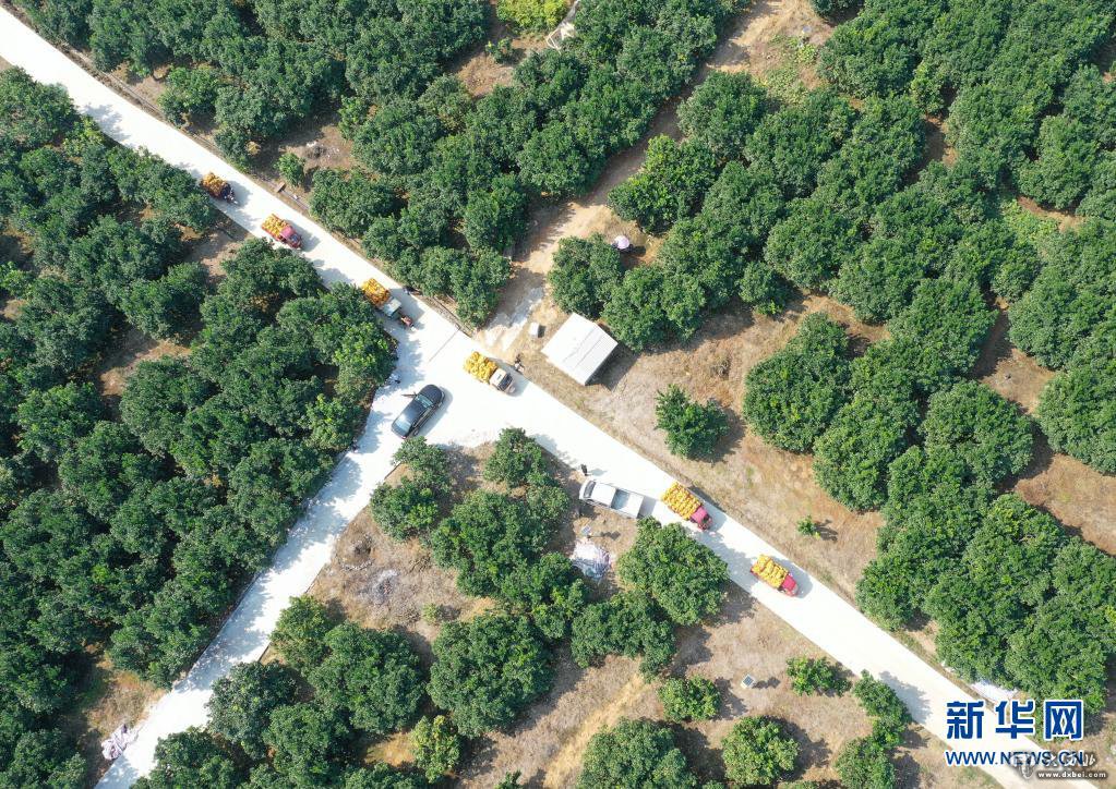 在广西罗城仫佬族自治县金玉柚生态产业扶贫示范区,装载柚子的车辆在柚子园内行驶(2019年11月5日摄,无人机照片)。新华社记者 陆波岸 摄