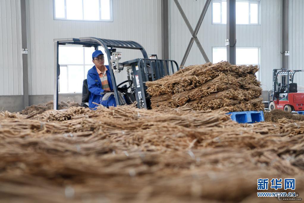 在甘肃省陇南市宕昌县哈达铺琦昆现代中药材仓储物流基地,工作人员使用叉车搬运中药材(2020年9月18日摄)。新华社记者 范培珅 摄
