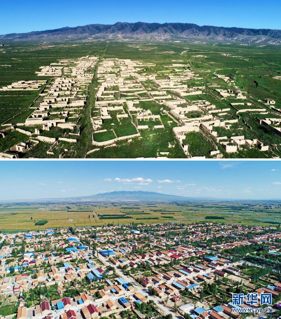 这是一张拼版照片,上图为:经过多年的生态修复,宁夏吴忠市红寺堡区新庄集乡的移民旧址已逐渐被绿色覆盖;下图为:戈壁荒滩上建起的红寺堡移民新村(2018年9月8日摄,无人机照片)。新华社记者 王鹏 摄