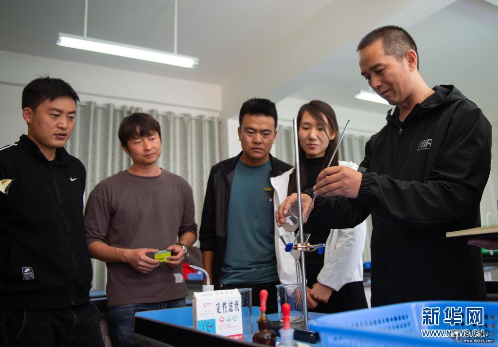 北京市援青支教教师、来自通州区陆辛庄学校的化学教师祁生贵(右一)在青海省玉树州第四民族高级中学指导学校教师进行实验教学(2020年8月12日摄)。新华社记者 陈钟昊 摄