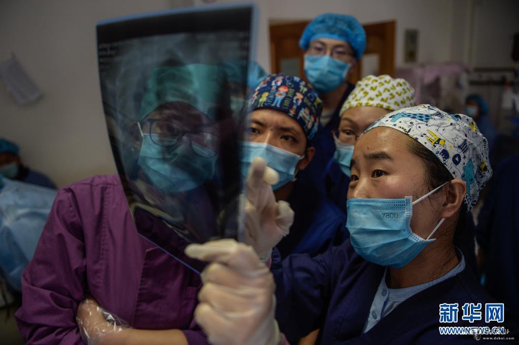 在西藏拉萨市人民医院内,首都儿科研究所的援藏医生韩同英(右一)进行教学查房时,与当地医生们一起研究入院新生儿胸片(2020年8月3日摄)。新华社记者 彭子洋 摄