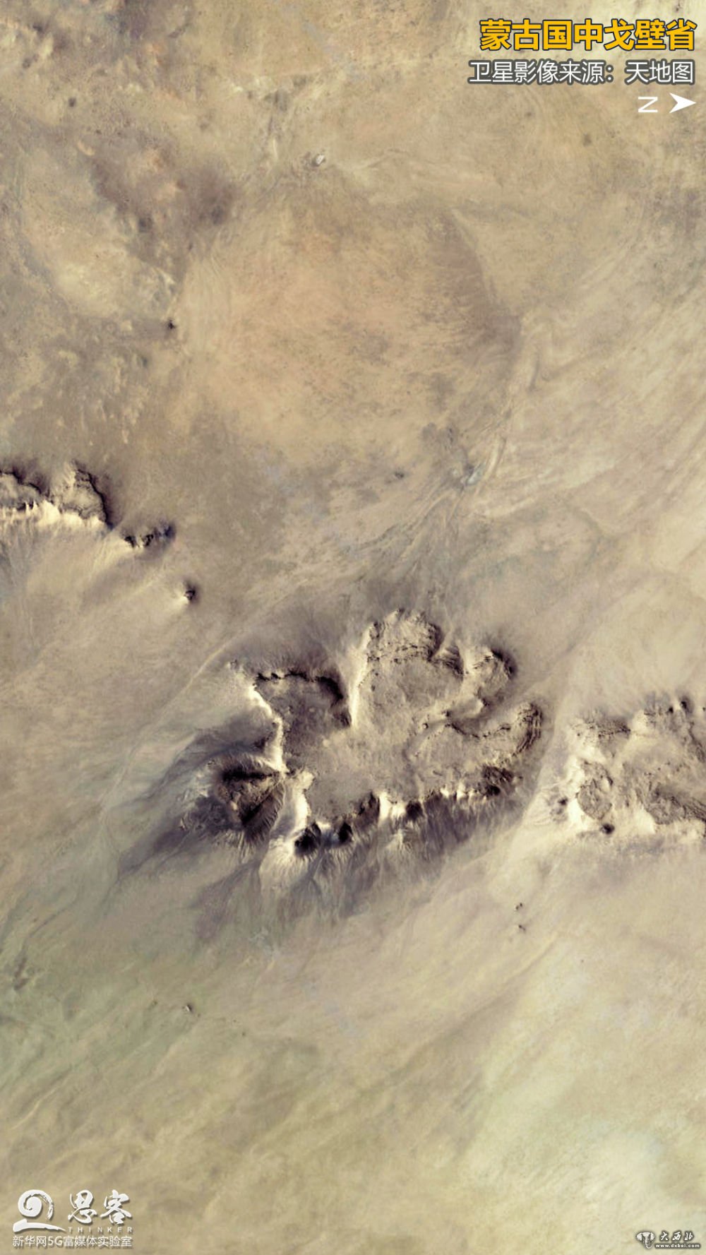 卫星拍到的蒙古国中戈壁省的部分区域,土地荒漠化程度肉眼可见。卫星影像来源:天地图