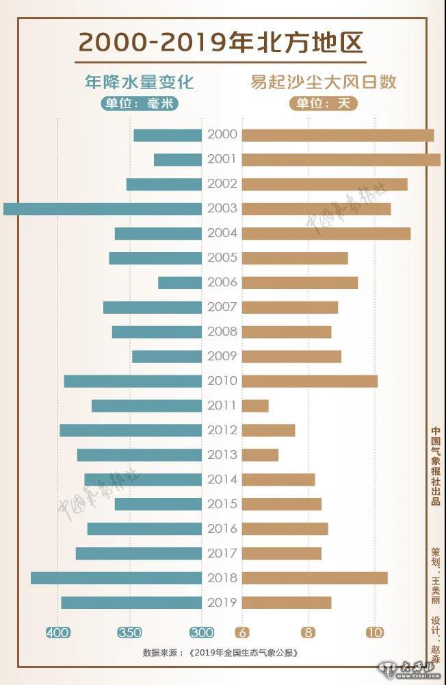 2000-2019年北方地区年降水量变化及易起沙尘大风日数。来源:中国气象报社