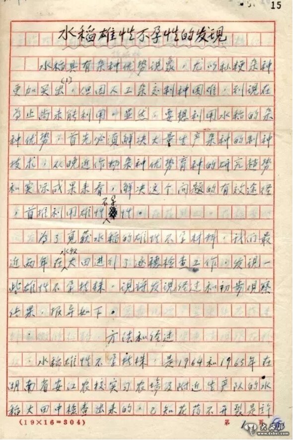 6年后,袁隆平发表第一篇论文《水稻的雄性不孕性》,刊登在中国科学院主编的《科学通报》半月刊第17卷第4期上。同年5月,国家科委九局局长赵石英看到后,以科委九局名义致函湖南省科委与安江农校,支持袁隆平的水稻雄性不育研究活动。