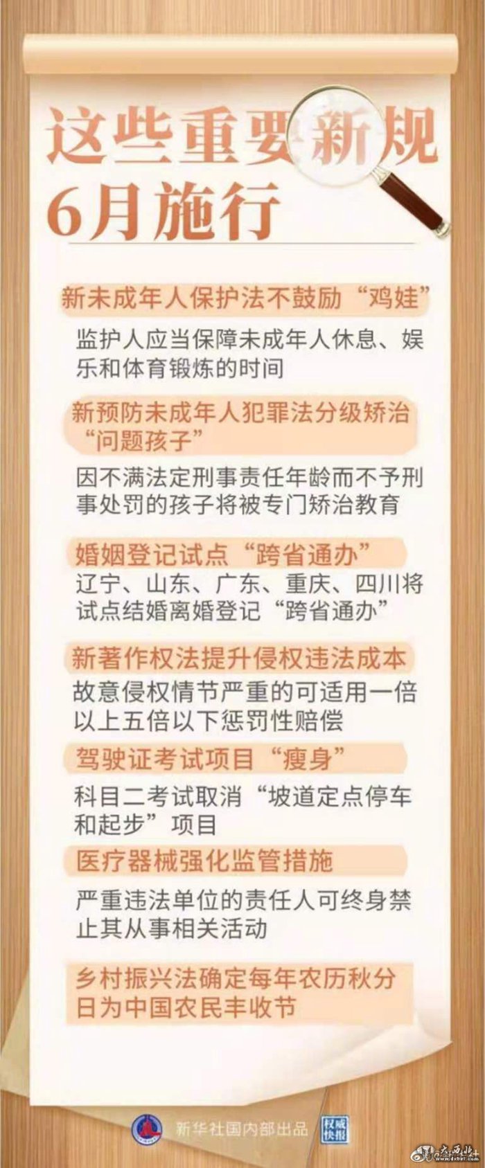 进入六月,两部有关未成年人重要法律六一施行,对学生减负、校园欺凌、网络沉迷等热点问题进行全面规定。此外,婚姻登记试点“跨省通办”、着作权侵权行为将被严惩、驾考科目“瘦身”、设立“中国农民丰收节”……这些民生新规里,哪条更牵动你的心?戳大图了解!(记者白阳;海报设计刘媛媛)