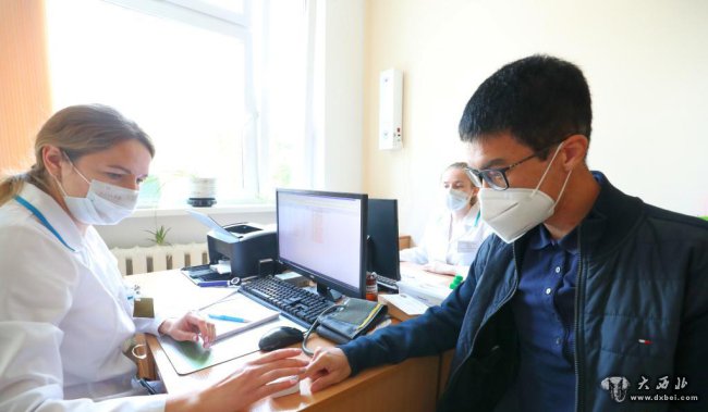 5月31日,在白俄罗斯首都明斯克,一名医务人员为准备接种新冠疫苗的中国公民做检查。