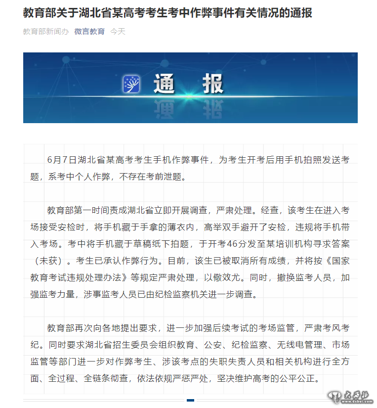教育部关于湖北省某高考考生考中作弊事件有关情况的通报