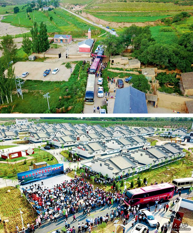 ▲ 上图为宁夏西吉县白崖乡半子沟村村民准备集体搬迁至宁夏银川市金凤区润丰村。下图为银川市金凤区润丰村迎来首批138 户移民入住,来自半子沟村的群众统一乘坐大巴搬出大山,来移民新村开始新生活(2017 年8月17日摄) 王鹏摄/ 本刊