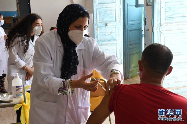 8月8日,在突尼斯首都突尼斯市一处新冠疫苗接种点,医务人员为一名男子接种疫苗。