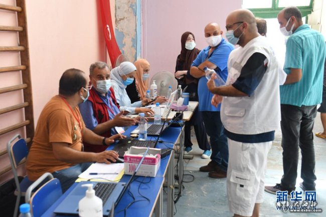8月8日,在突尼斯首都突尼斯市一处新冠疫苗接种点,人们登记接种疫苗。