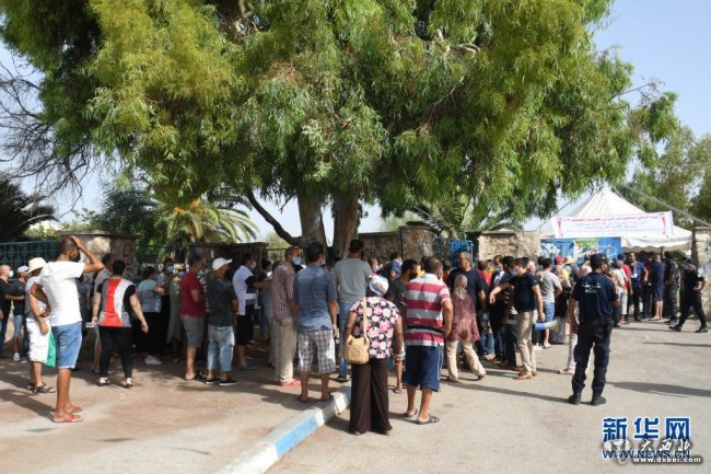 8月8日,人们在突尼斯首都突尼斯市一处新冠疫苗接种点排队等候接种疫苗。