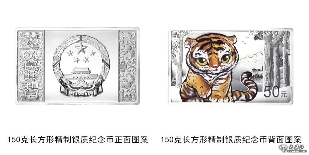 另外,150克长方形银质纪念币(彩色)背面图案为蹲坐的幼虎造型,衬以树林、远山等设计元素。