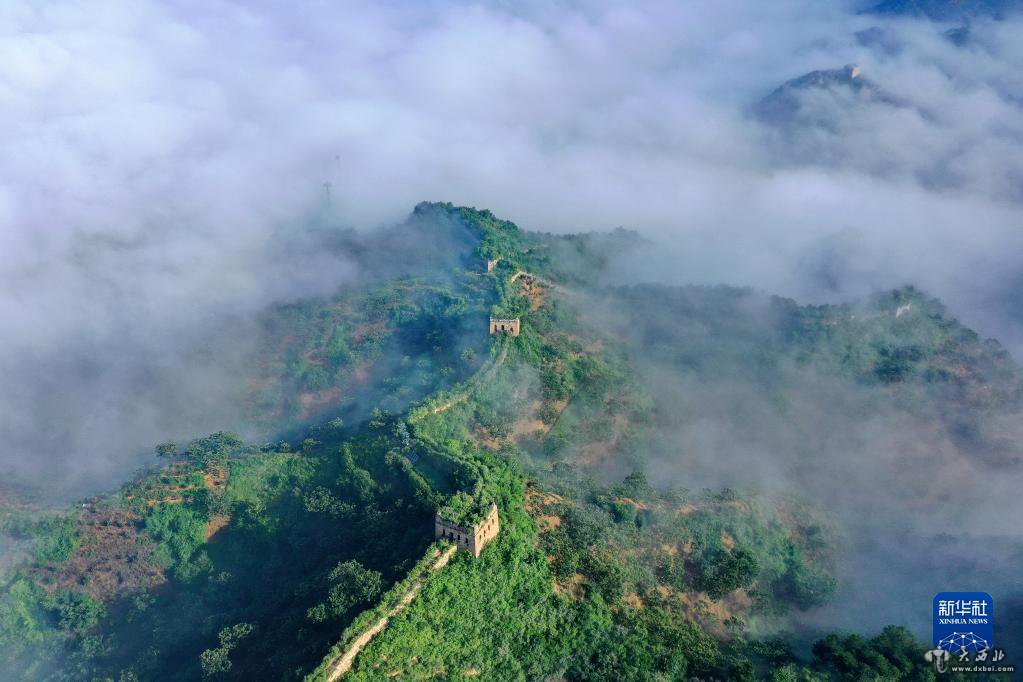 这是2020年8月25日拍摄的河北省迁西县榆木岭长城云海景观(无人机照片)。新华社记者牟宇摄