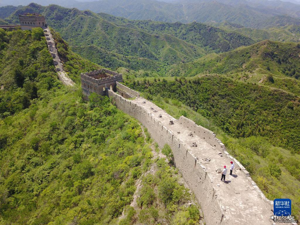 6月11日,在金山岭长城,技术人员在采集长城破损情况信息(无人机照片)。新华社发(王立群摄)