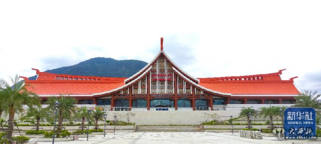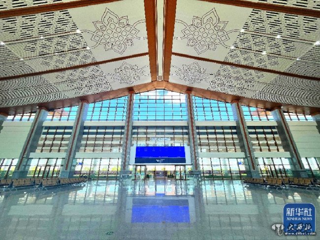 △中老铁路墨江站候车大厅。吊顶中间区域装饰有哈尼族群众喜爱的白鹇鸟环抱太阳的图案。