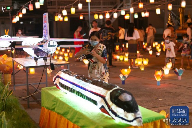 △2021年10月21日,在老挝首都万象,一名女子对着中老铁路“澜沧号”动车组花灯拍照。