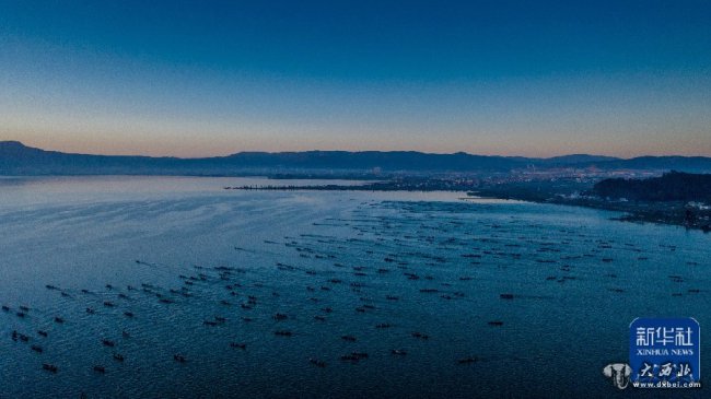 △渔船迎着朝阳浩浩荡荡驶入云南省玉溪市江川县星云湖中。
