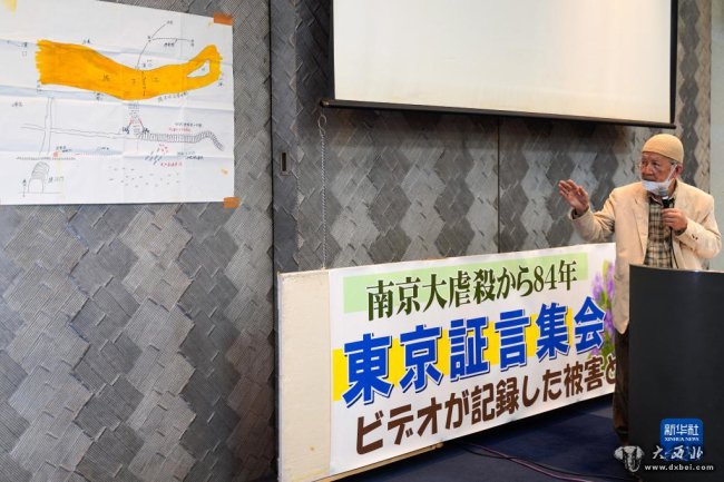 12月11日,在日本东京都YMCA亚洲青少年中心举行的“南京大屠杀84周年证言会”上,长期从事南京大屠杀相关历史研究的旅日侨胞林伯耀介绍煤炭港大屠杀地图。该地图由曾参加过南京大屠杀的侵华日军中士梶谷健郎在世时手绘。