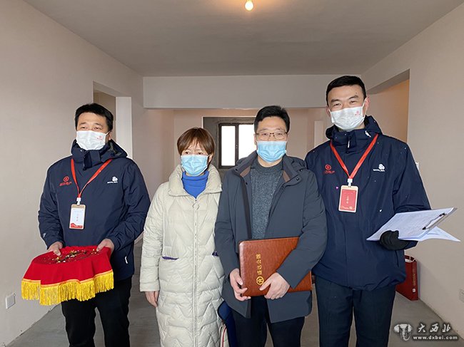 第一的领到钥匙的田姓业主验收后与工作人员在新房合影。 贾笑云 摄