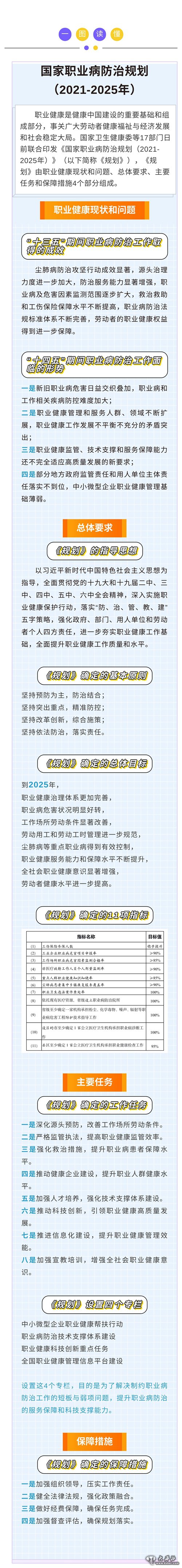 《规划》要求,到2025年,职业健康治理体系更加完善,职业病危害状况明显好转,工作场所劳动条件显著改善,劳动用工和劳动工时管理进一步规范,尘肺病等重点职业病得到有效控制,职业健康服务能力和保障水平不断提升,全社会职业健康意识显著增强,劳动者健康水平进一步提高。