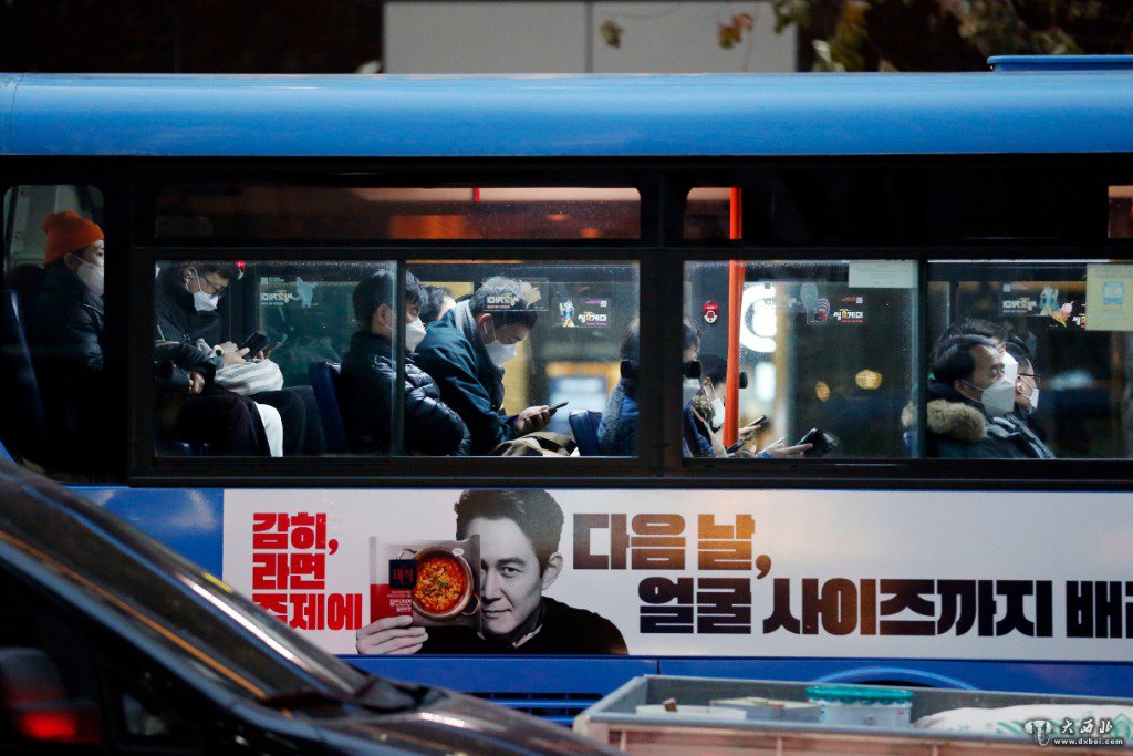 2021年11月29日,佩戴口罩的市民在韩国首尔乘坐公交车。(新华社记者王益亮摄)
