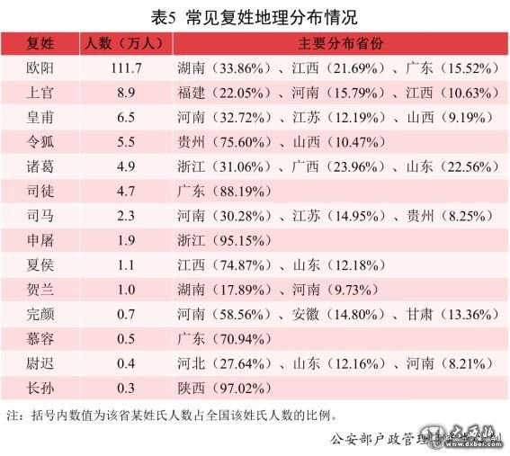 公安部户政管理研究中心24日发布2021年全国姓名报告。根据报告,姓氏在我国有着明显的地域分布特征。王、李、张等二十二个姓氏人口分布最多的省份是河南;陈、黄、吴等二十个姓氏人口分布最多的省份是广东;刘、孙、高等十二个姓氏人口分布最多的省份是山东;邹、熊、万三个姓氏人口分布最多的省份是江西。常见复姓“聚居”的特点非常突出,复姓人口在个别省份的分布较为集中。如,复姓“欧阳”33.86%的人口分布在湖南;复姓“上官”22.05%的人口分布在福建;复姓“皇甫”32.72%的人口分布在河南;复姓“令狐”75.60%的人口分布在贵州;复姓“诸葛”31.06%的人口分布在浙江;复姓“司徒”88.19%的人口分布在广东。(记者熊丰)