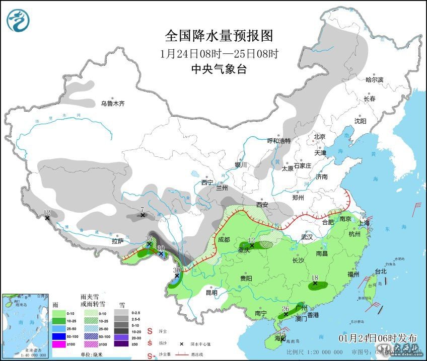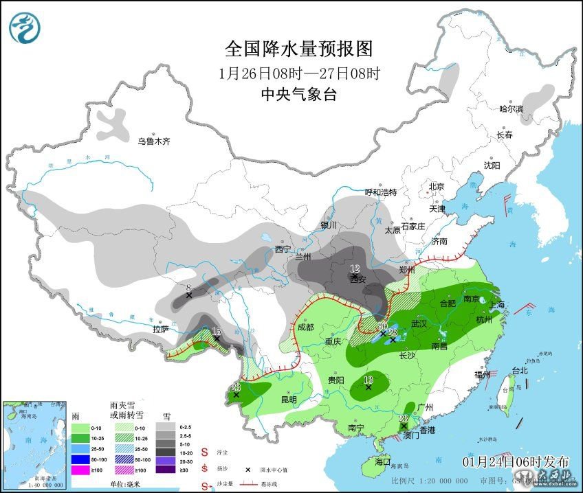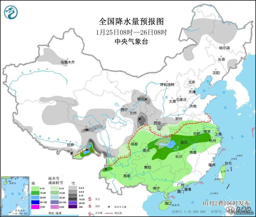 目前正值春运,中东部雨雪持续时间长、波及范围广,雨雪天气以及新增积雪对交通出行会有较大影响,公众请注意交通安全,合理安排出行计划。25日起,雨雪重心有所南移,河南、安徽、湖北、湖南、贵州一带雨雪相态复杂,大家请注意关注临近预报,做好防范。