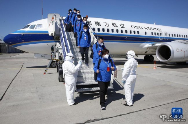2020年4月20日,在吉尔吉斯斯坦首都比什凯克玛纳斯国际机场,中国赴吉尔吉斯斯坦联合工作组成员走下飞机。联合工作组随机携带了由新疆维吾尔自治区捐赠的一批抗疫医疗物资。新华社发(罗曼摄)