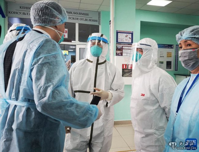 2020年4月14日,在哈萨克斯坦努尔苏丹第九综合医院,中国援哈医疗队成员与哈萨克斯坦医护人员交流如何优化医院管理减少院内感染。新华社发(哈萨克斯坦实业报供图)