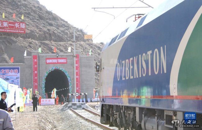 2016年2月27日,一列专列停在乌兹别克斯坦安格连-帕普铁路卡姆奇克隧道进口。中国政府优买项目、中铁隧道集团承担的中亚最长隧道--乌兹别克斯坦安格连-帕普铁路卡姆奇克隧道2月27日全隧贯通。卡姆奇克隧道长19.26公里,是中亚第一长隧。新华社记者沙达提摄