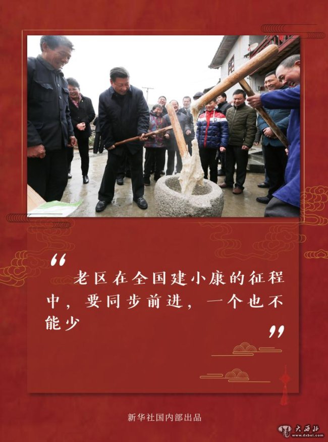 这年春节前夕,习近平总书记来到革命老区井冈山。看到一家正在打糍粑,习近平总书记饶有兴致地加入其中,同村民一起拿起木槌、打起糍粑来。总书记还给贫困户送去年货,给孩子们送去书包,祝家家都把年过好。