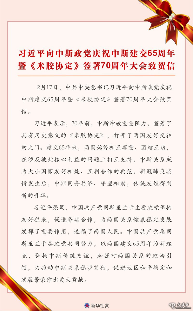 新华社北京2月17日电 2月17日,中共中央总书记习近平向中斯政党庆祝中斯建交65周年暨《米胶协定》签署70周年大会致贺信。