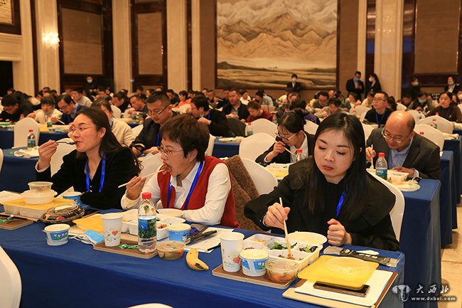 与会医师边吃盒饭(午饭)边听报告。 贾笑云 摄
