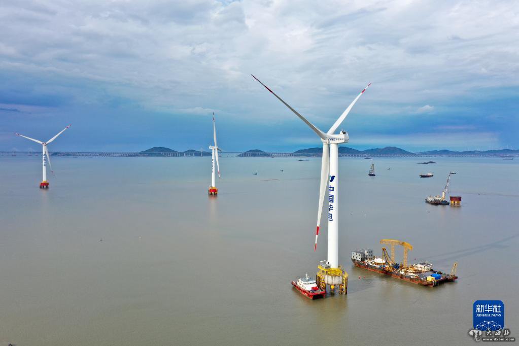 这是华电福清海坛海峡海上风电项目首台海上风电主控系统国产化机组(右)(2021年5月28日摄,无人机照片)。新华社记者姜克红摄