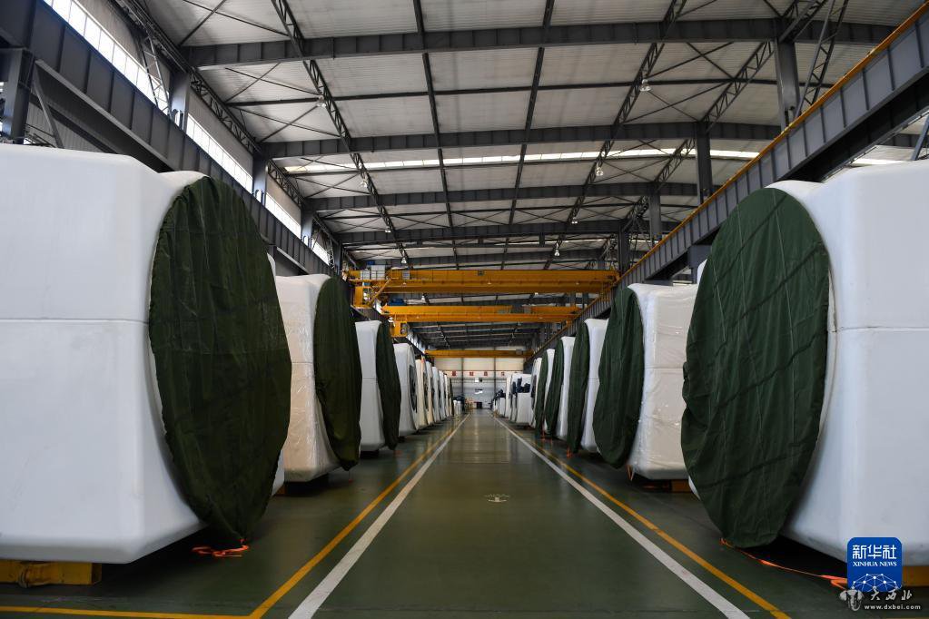 这是在内蒙古鄂尔多斯市一家能源装备有限公司生产车间拍摄的准备出售的风电机(2018年4月18日摄)。新华社记者刘磊摄