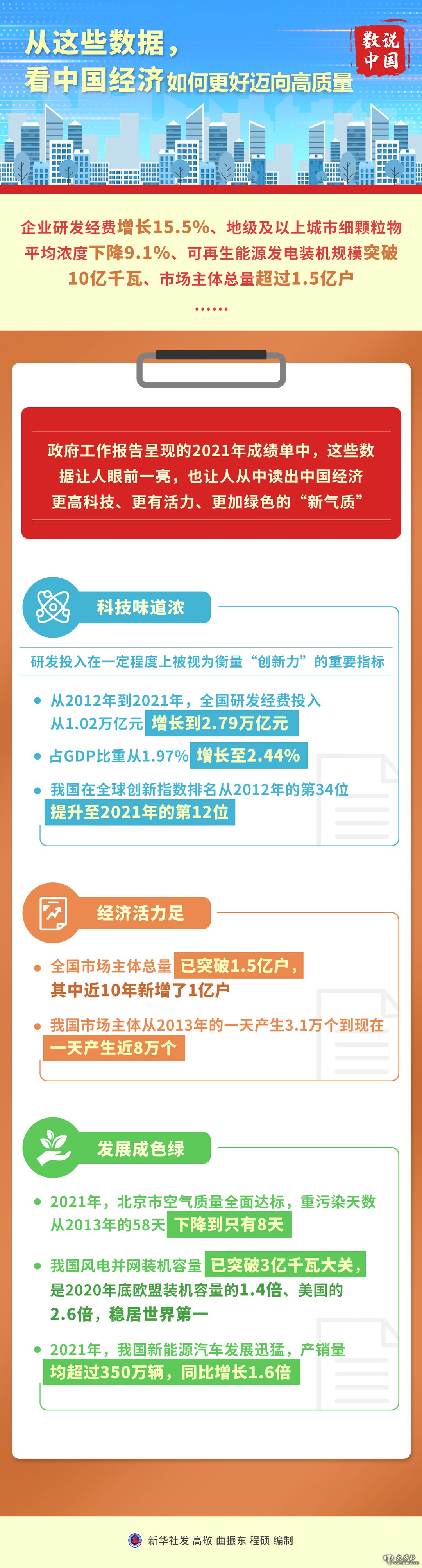 企业研发经费增长15.5%、市场主体总量超过1.5亿户、可再生能源发电装机规模突破10亿千瓦……政府工作报告呈现的2021年成绩单中,这些数据让人眼前一亮。同时,报告的一系列新部署,也让人从中读出中国经济更重创新、更加绿色,更坚定迈向高质量发展。