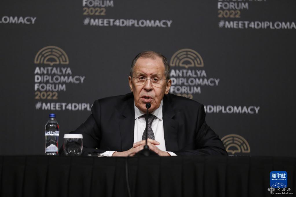 3月10日,在土耳其安塔利亚,俄罗斯外长拉夫罗夫与乌克兰外长库列巴(未在画面中)会谈后召开新闻发布会。新华社记者 李振北 摄