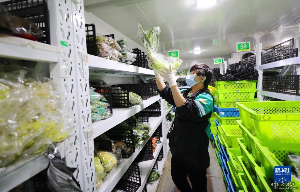 3月15日深夜,在位于上海闵行区老沪闵路的一家网络购物平台仓配站点,工作人员在冷藏库内将新到货的蔬菜分类摆放到货架上。新华社记者方喆摄