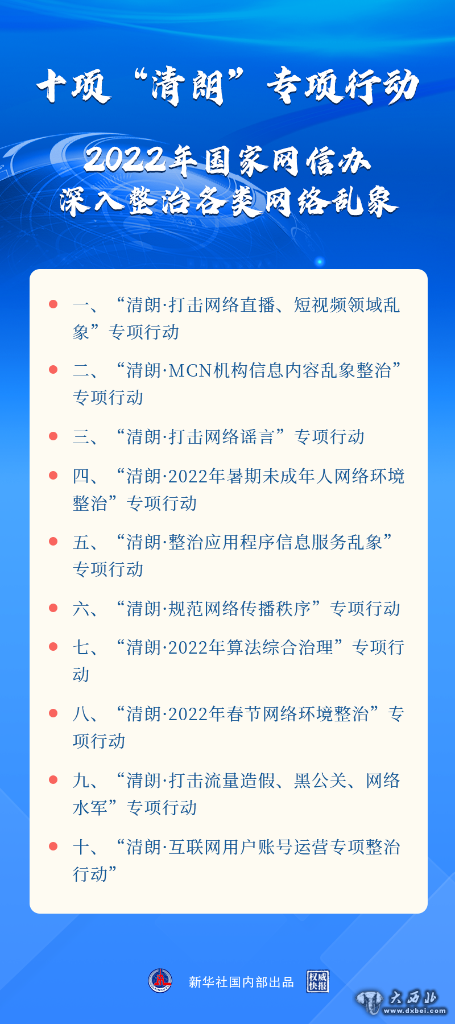 新华社北京3月17日电(记者王思北)记者17日从国新办举行的新闻发布会获悉,2022年“清朗”系列专项行动将重点开展打击网络谣言,打击网络直播、短视频领域乱象,算法综合治理,暑期未成年人网络环境整治等十方面任务。
