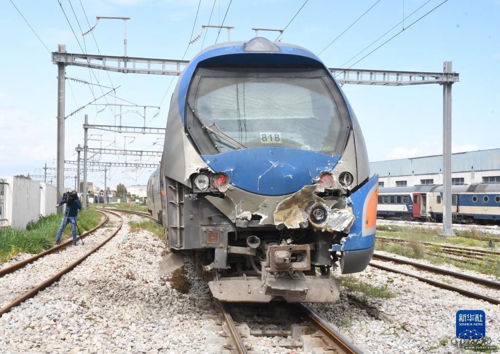 这是3月21日在突尼斯首都突尼斯市的事故现场拍摄的损毁列车。