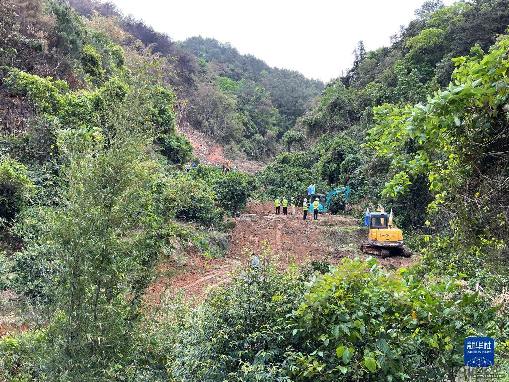 3月22日,在广西藤县埌南镇莫埌村,挖掘机开挖进入东航MU5735客机坠毁事故现场的通道,为后续工作铺平道路(手机照片)。新华社记者周华摄