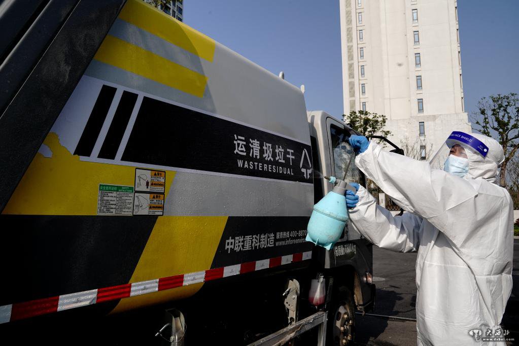 3月23日,上海闵行区吴泾环卫公司人员对垃圾清运车进行消毒。新华社记者张建松摄