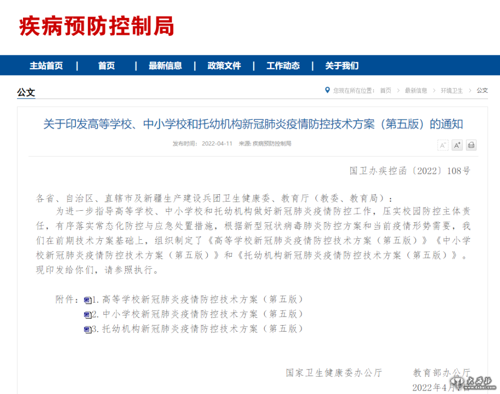 国家卫健委、教育部今天印发了高等学校、中小学校和托幼机构新冠肺炎疫情防控技术方案(第五版)。国家卫健委表示,近期全国多所学校出现聚集性疫情,暴露出了一些学校在疫情防控中仍然存在薄弱环节。为进一步科学指导各级学校和托幼机构做好新冠肺炎疫情防控工作,压实校园主体责任,有序落实常态化防控与应急处置措施,组织专家认真梳理了当前校园疫情防控常见风险点,根据新型冠状病毒肺炎防控方案和当前疫情形势需要,对此前相关技术方案进行修订调整,形成了《高等学校新冠肺炎疫情防控技术方案(第五版)》《中小学校新冠肺炎疫情防控技术方案(第五版)》和《托幼机构新冠肺炎疫情防控技术方案(第五版)》。