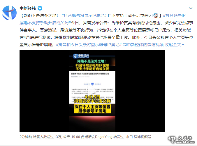 今日,抖音发布公告:为维护真实有序的讨论氛围,减少冒充热点事件当事人、恶意造谣、蹭流量等不良行为,抖音拟在个人主页等位置展示帐号IP属地,相关功能在4月底进行测试,将根据测试情况逐步在其他场景全量上线。此外,今日头条拟在个人主页等位置展示帐号IP属地。