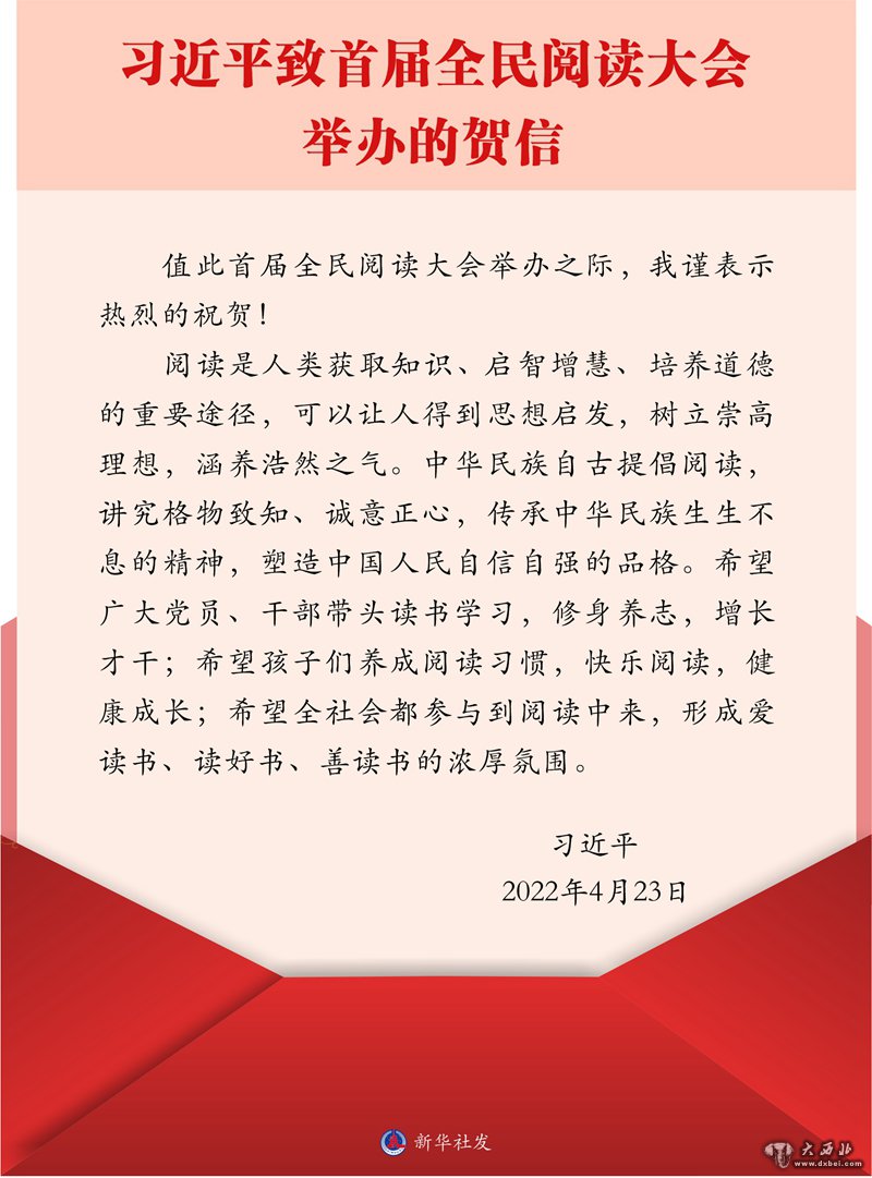 新华社北京4月23日电  首届全民阅读大会23日在京开幕。中共中央总书记、国家主席、中央军委主席习近平发来贺信,表示热烈的祝贺。