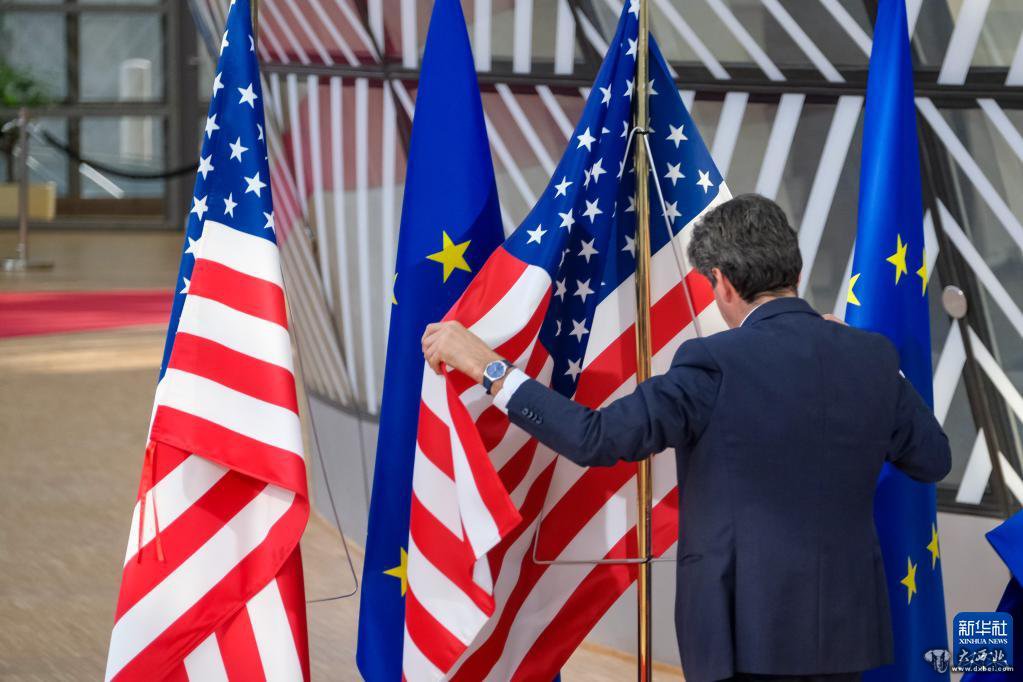 2022年3月24日,工作人员在比利时布鲁塞尔的欧盟总部整理美国国旗。北约、七国集团和欧盟三场峰会24日在比利时布鲁塞尔召开。新华社记者张铖摄